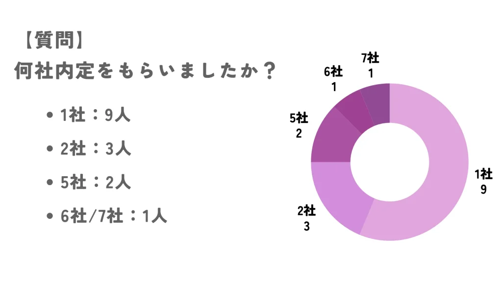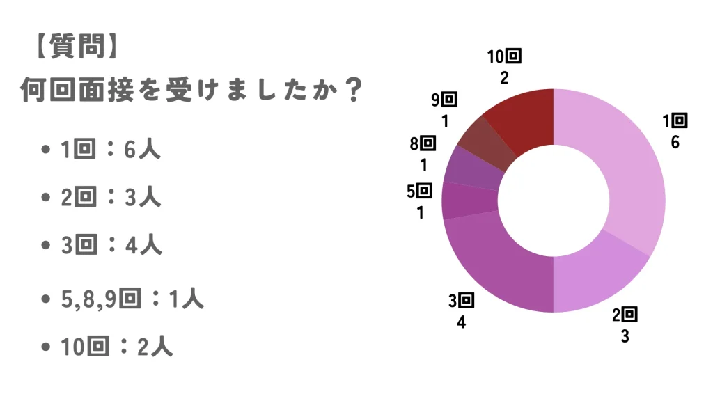 面接回数1回が最多で6人でした。知り合いの紹介で入社した人や、面接1回の企業に応募した人が多くいました。