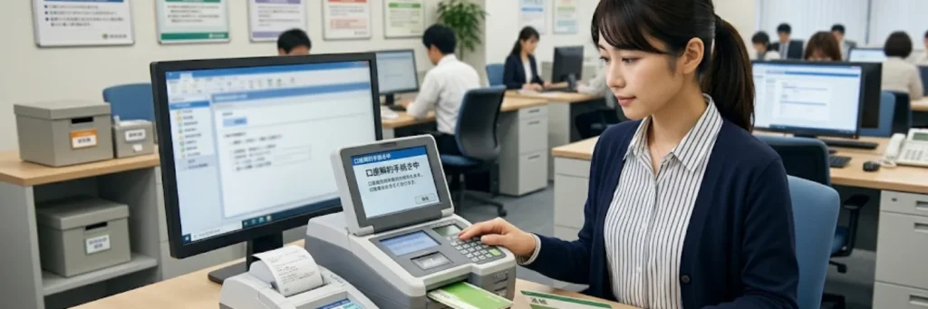 銀行事務は入出金管理・口座解約など